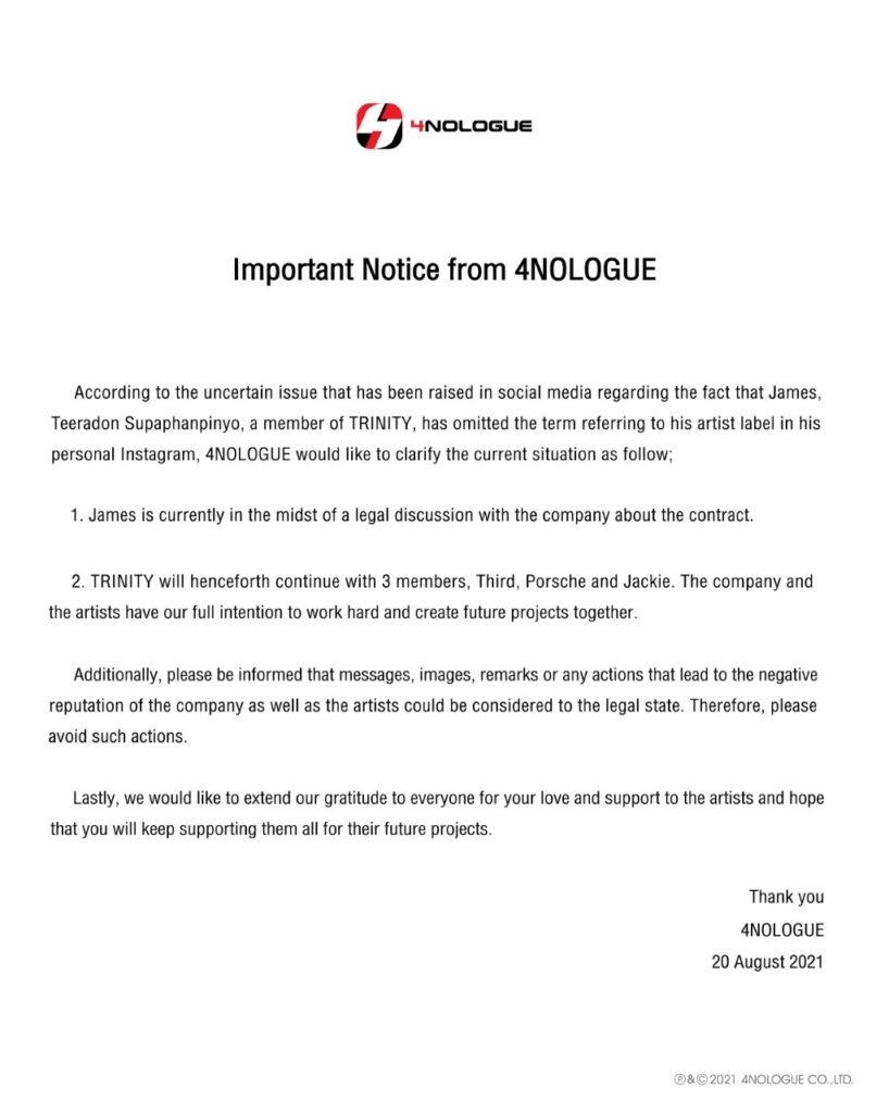 “ประกาศสำคัญจาก บริษัท โฟร์โนล็อค จำกัด เนื่องจากสัปดาห์ที่ผ่านมา มีประเด็นข้อสงสัยบนสังคมออนไลน์ และในสื่อต่าง ๆ เกี่ยวกับ “เจมส์-ธีรดนย์ ศุภพันธุ์ภิญโญ” หนึ่งในสมาชิกวง TRINITY ซึ่งได้ลบข้อความอันแสดงถึงต้นสังกัดออกจากอินสตาแกรมส่วนตัว ทางบริษัท โฟร์โนล็อค จำกัด จึงมีความจำเป็นที่จะต้องขอชี้แจง ดังนี้