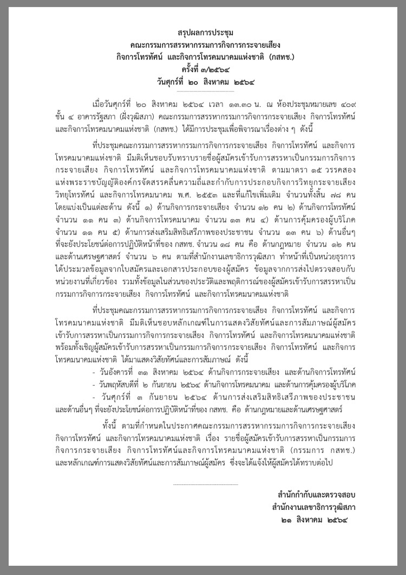คณะกรรมการสรรหา กสทช. รับทราบรายชื่อผู้สมัครกสทช. พร้อมเห็นชอบหลักเกณฑ์แสดงวิสัยทัศน์และการสัมภาษณ์