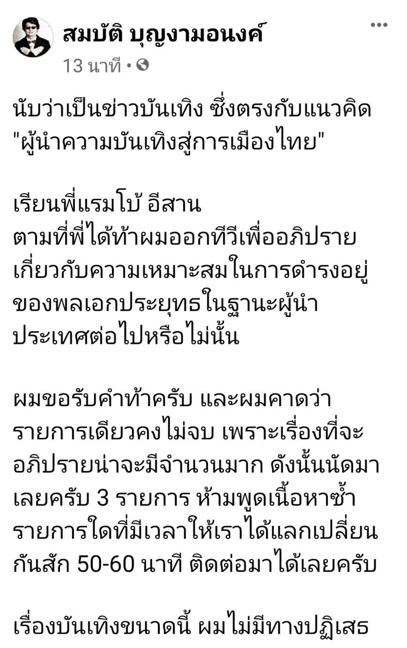 ทั้งนี้ ตนพร้อมที่จะไปออกทีวีร่วมกับนายสมบัติทุกรายการ ทุกช่องที่นายสมบัติอยากไป ขอให้นัดวันมาเลย ตนเองก็อยากรู้เหมือนกันว่าคนอย่างนายสมบัติจะเอาอะไรมาพูดออกรายการ เพราะตัวนายสมบัติเองวันๆไม่เคยทำประโยชน์อะไรเลยแล้วยังอยากจะมาดีเบตกับคนอื่น ตนเองขอเตือนว่าอย่าหิวแสงออกทีวีในตอนนี้เลยเพราะอาจจะกลายเป็นการประจานตัวเองออกทีวีมากกว่า