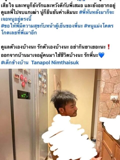 “วันนี้นิวนิวต้องขอโทษพ่อแม่ของพี่เติ้ลและเอฟซีพี่เติ้ล ที่ฝากให้นิวนิวดูแลเค้า นิวนิวคงทำได้แค่ เท่านี้จริงๆนิวนิวเคยคุยกับพี่เติ้ลเมื่อเกือบปีที่แล้วที่แกไม่ยอมออกไปไหนเลย นั่งอยู่แต่หน้าตู้เย็นเป็นปีๆ นิวนิวได้บอกกับพี่เติ้ลว่า จับมือไปด้วยกันหนูไหม หนูไม่อยากเห็นพี่ต้องอยู่แบบนี้ ถ้าวันนึงพี่ไม่โอเคพี่ พี่กลับมาตรงนี้ก็ได้นะหนูจะมาส่ง (ตรงหน้าตู้เย็นที่พี่นั่งมาเป็นปีๆ)รู้ไหมก่อนโควิดเราได้ไปเที่ยวกันแทบทุกที่ หนูพยายามทำให้พี่กลับมาเป็นคนปกติ ที่ใช้ชีวิตได้ปกติ มันอาจมีบางครั้งที่มันยากมาก ที่หนูต้องใช้ความเข้าใจ และ ความใจเย็นที่จะอยู่กับโรคที่พี่เป็นอยู่ หนูเฝ้ามองพี่และสังเกตุอาการของพี่ตลอดวันที่พี่เข้าโรงพยาบาลเกือบตาย หนูก็คิดว่าถ้าพี่ตายหนูก็คงจะอยู่ไม่ได้จนพี่เลิกกินเหล้า กินยารักษาอาการที่ป่วยทางสุขภาพและทางจิตใจ ไบโพล่า,ซึมเศร้า,toxic people หนูดีใจที่พี่อาการดีขึ้นเรื่อยๆ เราก็พากันไปทำนู้นทำนี่ด้วยกัน ให้เหมือนคนปกติหนูก็คิดว่าเราก็มีความสุขมากๆเลยเนอะ พี่ไม่เคยทำให้หนูเสียใจเลย พี่ก็ดูแลหนูแบบที่พี่ไม่เคยทำให้ใครมาก่อน หนูก็ดีใจนะพี่รู้ไหม หนูต้องสังเกตุอาการของโรค และใช่ความอดทน กับบางครั้งที่โรคพี่กำเริบ ซึ่งพี่อาจจะไม่รู้ตัว (แต่หนูไม่เคยโกรธพี่เลย)จนมาวันนี้วันที่หนได้มาเห็นพึ่ นั่งไม่มีสติอยู่หน้าต้เย็น เสียใจ และหนูก็ยังรักและหวังดีกับพี่เสมอ และยังอยากอยู่ดูแลพี่ไปจบแก่เฒ่าหนูก็ยืนยันคำเดิมนะ พี่หันหลังมาก็จะเจอหนูอยู่ตรงนี้ขอให้พี่มีความสุขกับหน้าตู้เย็นของพี่นะ หนูแม่งโคตรโกรธเลยที่พี่เมาอีกดูแลตัวเองบ้างนะรักตัวเองบ้างนะ อย่ากินยาเยอะนะ ออกจากบ้านมาเจอผู้คนมาใช้ชีวิตบ้างนะ รักพี่นะ”