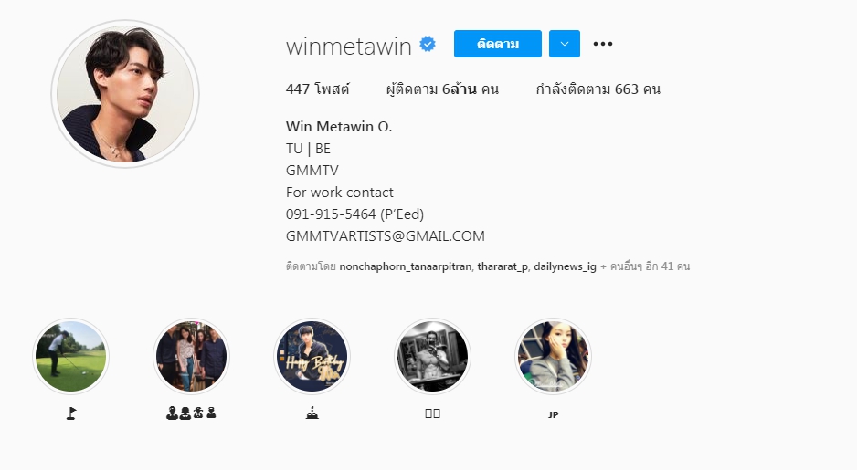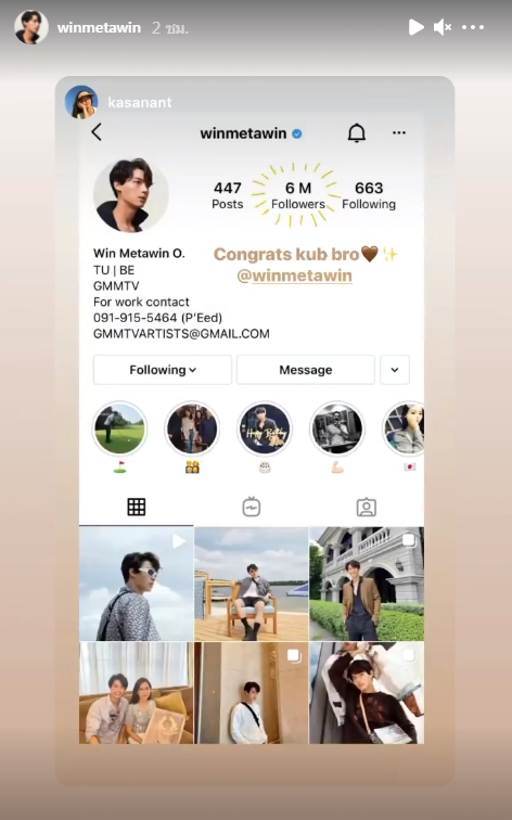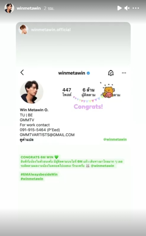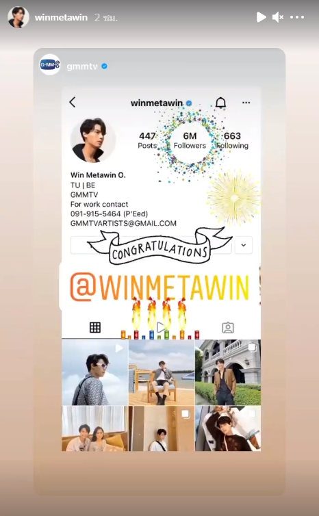 โดยล่าสุดหนุ่มวิน ได้โพสต์ความเคลื่อนไหวทั่วไป ผ่านไอจีสตอรี่ของตัวเอง พร้อมโชว์ยอดคนฟอลโลว์ไอจีครบ 6 ล้านคน นอกจากนี้โซเชี่ยลของแกรมมี่ทีวี ก็โพสต์แสดงความยินดีเช่นเดียวกันว่า Congrats! @winmetawin for 6M! followers on IG #6MAlwaysbesideWin #GMMTV