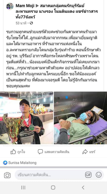 ขณะนี้แบงค์เข้ารักษาตัวอยู่ที่โรงพยาบาล อาการสาหัส เพราะได้รับการกระทบกระเทือนทางศีรษะอย่างรุนแรง จนกระโหลกศีรษะร้าว ต้องรอสแกนสมองดูอาการอีกครั้ง คุณแม่เฝ้าดูอาการอย่างใกล้ชิดด้วยความอาการเจียนใจสลาย เพราะหวั่นว่าลูกชายจะต้องผ่าตัดสมอง ขณะที่คดีไม่คืบหน้า เพราะตำรวจยังไม่สามารถตามหาผู้ร้ายได้ แม่และญาติวอนขอร้องประชาชนที่ทราบเบาะแสกรุณาแจ้งตำรวจด่วนเพื่อตามหาผู้ร้ายมารับโทษและไม่เป็นภัยต่อสังคมสร้างความรุนแรงและทำร้ายร่างกายผู้อื่น