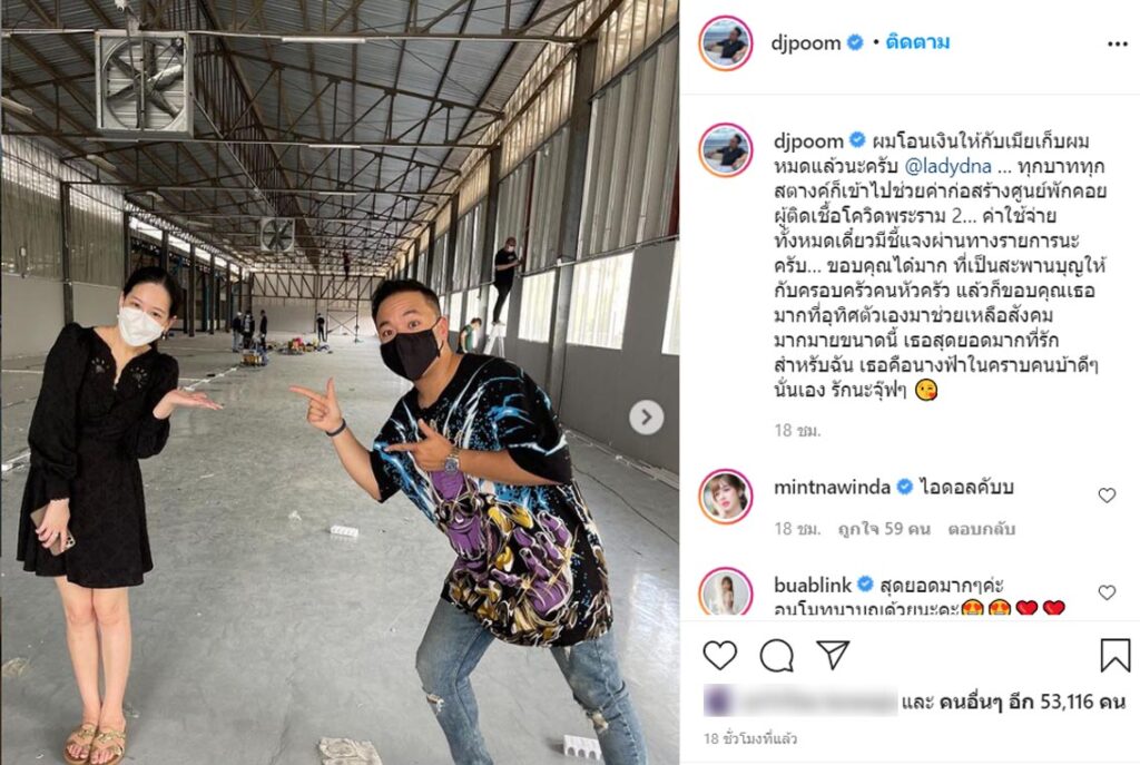 “ผมโอนเงินให้กับเมียเก็บผม หมดแล้วนะครับ @ladydna … ทุกบาททุกสตางค์ก็เข้าไปช่วยค่าก่อสร้างศูนย์พักคอยผู้ติดเชื้อโควิดพระราม 2… ค่าใช้จ่ายทั้งหมดเดี๋ยวมีชี้แจงผ่านทางรายการนะครับ…