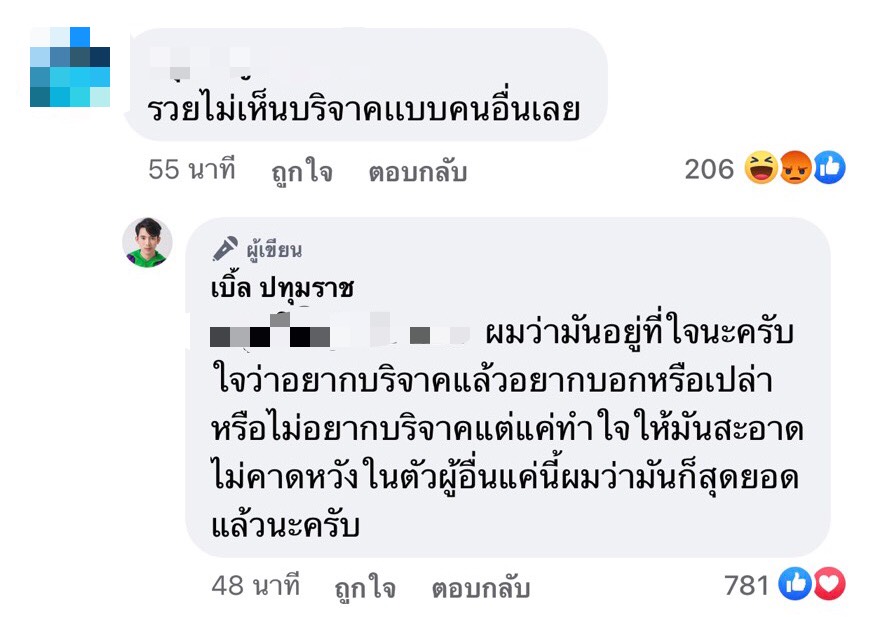 จริงๆแล้วมีเยอะนะครับ ส่วนใหญ่คนที่ไปคอนเมนต์ว่า ทำไมคุณรวย คุณมีชื่อเสียง คุณถึงไม่บริจาคของ ผมว่าจริง ๆ แล้ว กลุ่มคนพวกนี้เราต้องดูที่มาที่ไปของเขาด้วย บางคนเขาอาจจะสร้างเฟสบุ๊คเป็นอวตาร เพื่อมาปั่นให้เรารู้สึกว่าอยากโมโหกับเขา แต่บางคนเขาก็อาจจะไม่รู้ว่าเราทำหรือไม่ทำ เพราะฉะนั้นเบิ้ลเชื่อว่า การที่เราทำหรือไม่ทำ เรารู้ตัวเรา เราไม่จำเป็นที่จะไปบอกเขาหรือไปคาดหวังอะไรในตัวผู้อื่น เราทำด้วยตัวของเราเองดีกว่า