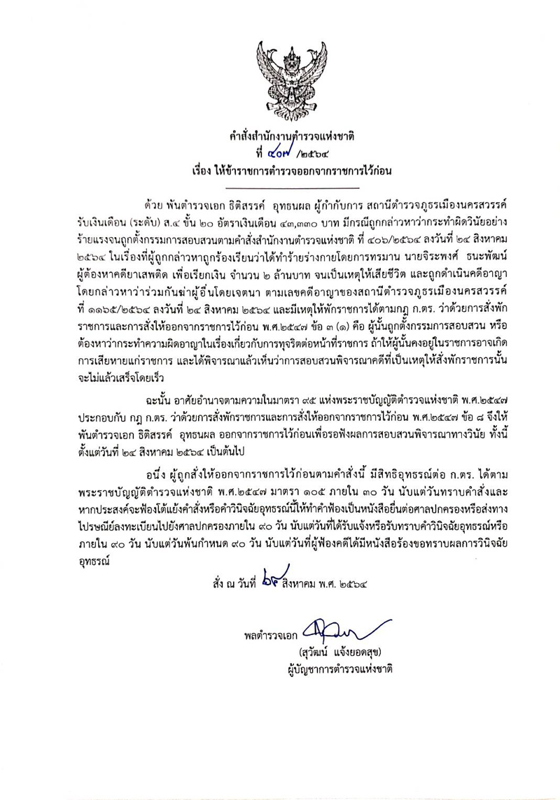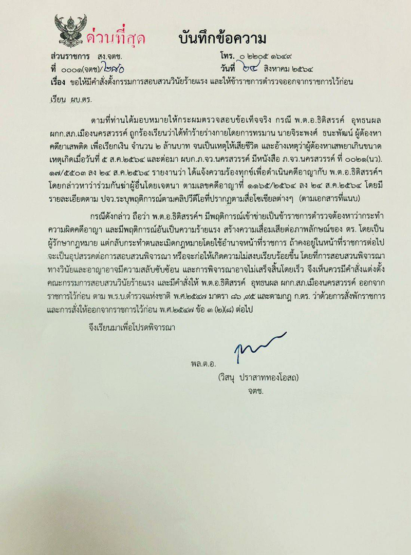 พล.ต.อ.วิสนุ ปราสาททองโอสถ จเรตำรวจแห่งชาติ มีบันทึกข้อความด่วนที่สุด 001(จตช)/280 เรียน พล.ต.อ.สุวัฒน์ แจ้งยอดสุข ผบ.ตร. เรื่อง ขอให้มีคำสั่งตั้งกรรมการสอบสวนวินัยร้ายแรง และให้ข้าราชการตำรวจออกจากราชการไว้ก่อน หลัง ผบ.ตร.มอบหมายให้ตรวจสอบข้อเท็จจริง กรณี พ.ต.อ.ธิติสรรค์ อุทธนผล ผกก.สภ.เมืองนครสวรรค์ ถูกร้องเรียนว่าได้ทำร้ายร่างกายโดยการทรมาน นายจิระพงศ์ ธนะพัฒน์ ผู้ต้องหาคดียาเสพติด เพื่อเรียกเงิน จำนวน 2 ล้านบาท จนเป็นเหตุให้เสียชีวิต และอ้างเหตุว่าผู้ต้องหาเสพยาเกินขนาด เหตุเกิดเมื่อวันที่ 5ส.ค.2564 และต่อมา ผบก.ภ.จว.นครสวรรค์ มีหนังสือ ภ.จว.นครสวรรค์ ได้แจ้งความร้องทุกข์เพื่อดำเนินคดีอาญากับ พ.ต.อ.ธิติสรรค์โดยกล่าวหาว่าร่วมกันฆ่าผู้อื่นโดยเจตนา ระบุพฤติการณ์ตามคลิปวีโอที่ปรากฎตามสื่อโซเชียลต่างๆ