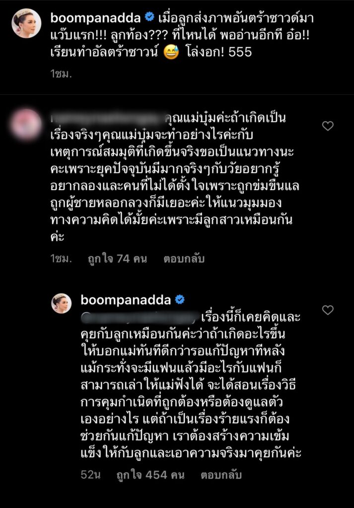 โดยสาวบุ๋ม ได้ตอบกลับคอมเมต์ของแฟนคลับคนดังกล่าวว่า “เรื่องนี้ก็เคยคิดและคุยกับลูกเหมือนกันค่ะว่าถ้าเกิดอะไรขึ้นให้บอกแม่ทันทีดีกว่ารอแก้ปัญหาทีหลัง แม้กระทั่งจะมีแฟนแล้วมีอะไรกับแฟนก็สามารถเล่าให้แม่ฟังได้ จะได้สอนเรื่องวิธีการคุมกำเนิดที่ถูกต้องหรือต้องดูแลตัวเองอย่างไร แต่ถ้าเป็นเรื่องร้ายแรงก็ต้องช่วยกันแก้ปัญหา เราต้องสร้างความเข้มแข็งให้กับลูกและเอาความจริงมาคุยกันค่ะ”