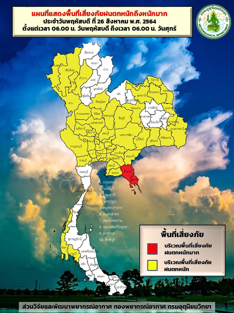 พยากรณ์อากาศ 24 ชั่วโมงข้างหน้า ร่องมรสุมพาดผ่านภาคเหนือ และภาคตะวันออกเฉียงเหนือตอนบน ประกอบกับมรสุมตะวันตกเฉียงใต้ที่พัดปกคลุมทะเลอันดามัน ประเทศไทย และอ่าวไทยมีกำลังแรงขึ้น ลักษณะเช่นนี้ทำให้บริเวณประเทศไทยมีฝนเพิ่มขึ้น กับมีฝนตกหนักถึงหนักมากบางแห่งในภาคเหนือ ภาคตะวันออกเฉียงเหนือ ภาคกลาง ภาคตะวันออก และภาคใต้ฝั่งตะวันตก ขอให้ประชาชนในบริเวณพื้นที่เสี่ยงภัยระวังอันตรายจากฝนตกหนักและฝนที่ตกสะสม ซึ่งอาจทำให้เกิดน้ำท่วมฉับพลัน น้ำป่าไหลหลากในระยะนี้ไว้ด้วย สำหรับคลื่นลมบริเวณทะเลอันดามันตอนบนและอ่าวไทยตอนบนมีกำลังปานกลาง โดยมีคลื่นสูงประมาณ 2 เมตร บริเวณที่มีฝนฟ้าคะนองคลื่นสูงมากกว่า 2 เมตร ชาวเรือบริเวณดังกล่าวควรเพิ่มความระมัดระวังในการเดินเรือบริเวณที่มีฝนฟ้าคะนองไว้ด้วย
