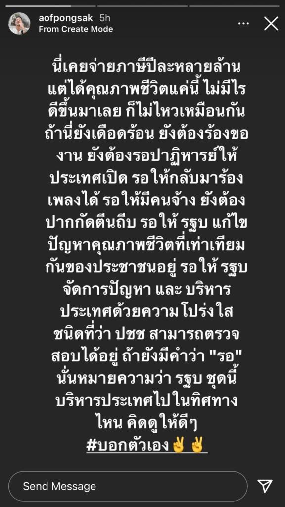 “นี่เคยจ่ายภาษีปีละหลายล้าน แต่ได้คุณภาพชีวิตแค่นี้ ไม่มีไรดีขึ้นมาเลย ก็ไม่ไหวเหมือนกัน ถ้านี่ยังเดือดร้อน ยังต้องร้องของาน ยังต้องรอปาฏิหาริย์ให้ประทศเปิด รอให้กลับมาร้องเพลงได้ รอให้มีคนจ้าง ยังต้องปากกัดตีนถีบ รอให้ รฐบ แก้ไขปัญหาคุณภาพชีวิตที่เท่าเทียมกันของประชาชนอยู่ รอให้ รฐบ จัดการปัญหา และบริหารประเทศด้วยความโปร่งใส ชนิดที่ว่า ปชช.สามารถตรวจสอบได้อยู่ ถ้ายังมีคำว่า “รอ” นั่นหมายความว่า รฐบ ชุดนี้ บริหารประเทศไปในทิศทางไหน คิดดูให้ดีๆ #บอกตัวเอง ✌️✌️