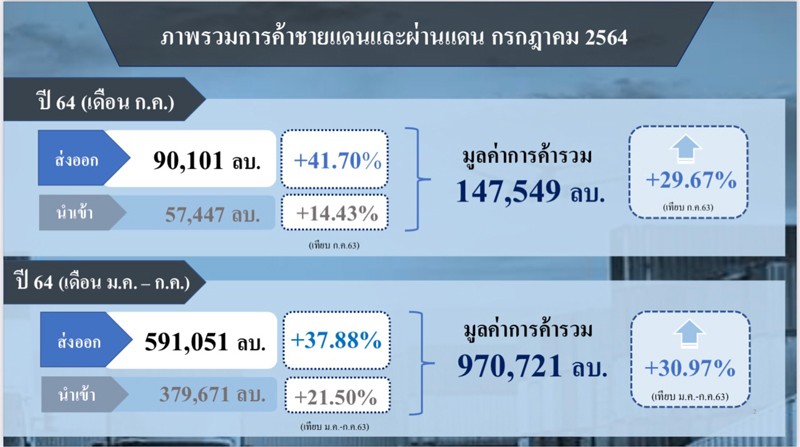 นายจุรินทร์ ลักษณวิศิษฏ์ รองนายกรัฐมนตรีและรัฐมนตรีว่าการกระทรวงพาณิชย์เผยตัวเลขการค้าชายแดนและการค้าผ่านแดนของไทย ในช่วงเดือนกรกฎาคม 2564 พบว่า การค้าขยายตัวเพิ่มขึ้นร้อยละ 29.67 คิดเป็นมูลค่ากว่า 1.4 แสนล้านบาท เป็นการส่งออกขยายตัวร้อยละ 41.7 มูลค่ากว่า 9 หมื่นล้านบาท ในขณะที่การค้าในช่วง 7 เดือนแรกของปี 2564 ขยายตัวร้อยละ 30.97 คิดเป็นมูลค่ากว่า 9.7 แสนล้านบาท เป็นการส่งออกขยายตัวร้อยละ 37.88 คิดเป็นมูลค่า 5.9 แสนล้านบาท
