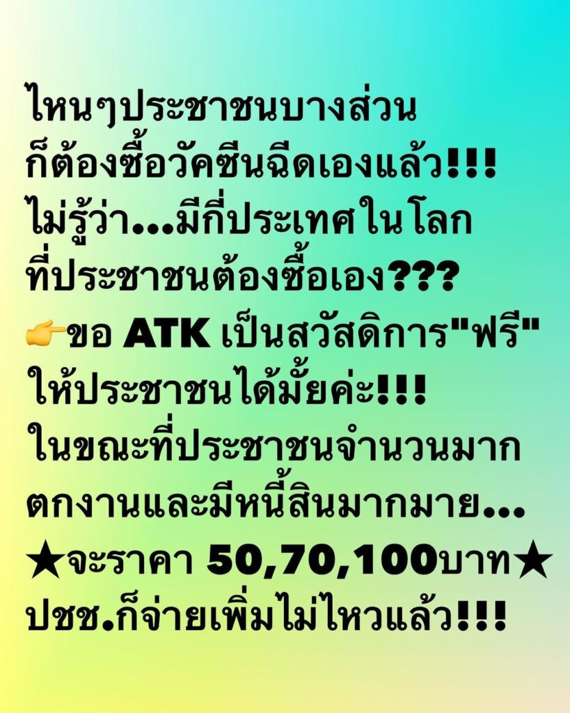 ล่าสุดเจ้าตัวเคลื่อนไหวในอินสตาแกรมอีก โดยบอกว่า “ไหนๆประชาชนบางส่วนก็ต้องซื้อวัคซีนฉีดเองแล้ว ไม่รู้ว่า มีกี่ประเทศในโลกที่ประชาชนต้องซื้อเอง ขอ ATK เป็นสวัสดิการ ฟรี ให้ประชาชนได้มั้ยคะ ในขณะที่ประช่ชนจำนวนมากตกงานและมีหนี้สินมากมาย จะราคา 50,70,100 บาท ประชาชนก็จ่ายเพิ่มไม่ไหวแล้ว”
