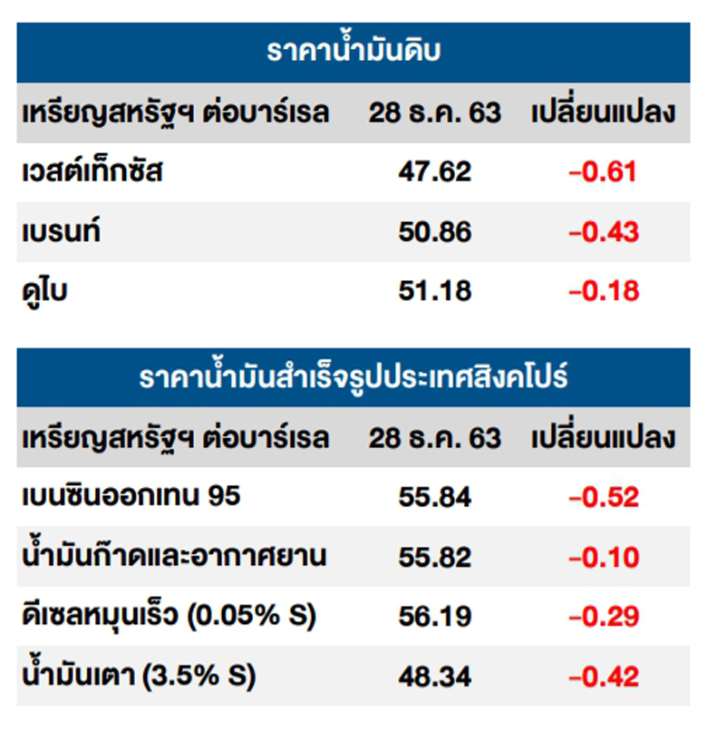บริษัท ไทยออยล์ จำกัด (มหาชน) รายงานสถานการณ์น้ำมันดิบปิดตลาดประจำวันที่ 28 ธ.ค. 63 น้ำมันดิบเวสต์เท็กซัสลดลง 0.61 ดอลลาร์ ปิดที่ 47.62 ดอลลาร์ต่อบาร์เรล ส่วนน้ำมันดิบเบรนท์ปรับลดลง 0.43 ดอลลาร์ ปิดที่ 50.86 ดอลลาร์ต่อบาร์เรล โดยราคาน้ำมันดิบปรับลดลง หลังได้รับแรงกดดันจากความต้องการใช้น้ำมันที่มีแนวโน้มชะลอตัวลง จากการแพร่ระบาดของเชื้อไวรัสโควิด-19 ที่มีความรุนแรงเพิ่มขึ้นจากการกลายพันธุ์ของเชื้อโควิด-19 ซึ่งทำให้แพร่กระจายได้ง่ายขึ้น ล่าสุดองค์การอนามัยโลก (WHO)ระบุว่า ตรวจพบโควิด-19 ที่กลายพันธุ์นี้ในประเทศ ญี่ปุ่น, เดนมาร์ก, เนเธอร์แลนด์, อิตาลี, ออสเตรเลีย และภูมิภาคแอฟริกาใต้ ส่งผลให้หลายประเทศเพิ่มความเข้มงวดของมาตรการป้องกันการแพร่ระบาดเพิ่มขึ้น ขณะที่ปริมาณการผลิตน้ำมันดิบของกลุ่มโอเปกและประเทศพันธมิตรมีแนวโน้มปรับเพิ่มขึ้นต่อเนื่อง โดยกลุ่มผู้ผลิตจะมีการทบทวนปริมาณการผลิตอีกครั้งในวันที่ 4 ม.ค. ว่าจะมีการปรับเพิ่มขึ้นต่อเนื่องหรือไม่ ล่าสุดแหล่งข่าวจากรัสเซียคาดว่ากลุ่มผู้ผลิตจะเดินหน้าปรับเพิ่มกำลังการผลิตขึ้นอีกราว 500,000 บาร์เรลต่อวัน ด้านเศรษฐกิจสหรัฐฯ มีแนวโน้มฟื้นตัวขึ้น หลังประธานาธิบดีโดนัลด์ ทรัมป์ ได้ลงนามอนุมัติมาตรการกระตุ้นเศรษฐกิจของสหรัฐฯ วงเงิน 9 แสนล้านดอลลาร์สหรัฐฯ เพื่อเยียวยาผลกระทบโควิด-19 และได้อนุมัติร่างงบประมาณใหม่ของสหรัฐฯ แล้ว