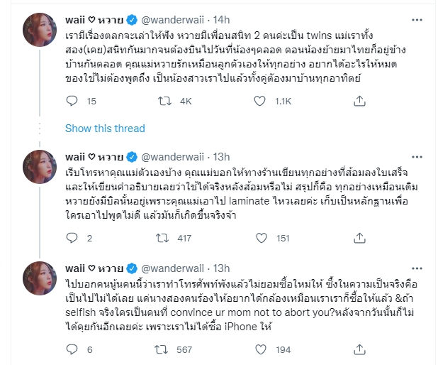 รีบโทรหาคุณแม่ตัวเองบ้าง คุณแม่บอกให้ทางร้านเขียนทุกอย่างที่ซ่อมลงใบเสร็จและให้เขียนคำอธิบายเลยว่าใช้ได้จริงหลังซ่อมหรือไม่ สรุปก็คือ ทุกอย่างเหมือนเดิม หวายยังมีบิลนั้นอยู่เพราะคุณแม่เอาไป laminate ไว้เลยค่ะ เก็บเป็นหลักฐานเพื่อใครเอาไปพูดไม่ดี แล้วมันก็เกิดขึ้นจริงจ้า ไปบอกคนนู้นคนนี้ว่าเราทำโทรศัพท์พังแล้วไม่ยอมซื้อใหม่ให้ ซึ่งในความเป็นจริงคือเป็นไปไม่ได้เลย แค่นางสองคนร้องไห้อยากได้กล้องเหมือนเราเราก็ซื้อให้แล้ว &ถ้า selfish จริงใครเป็นคนที่ convince ur mom not to abort you? หลังจากวันนั้นก็ไม่ได้คุยกันอีกเลยค่ะ เพราะเราไม่ได้ซื้อ iPhone ให้”