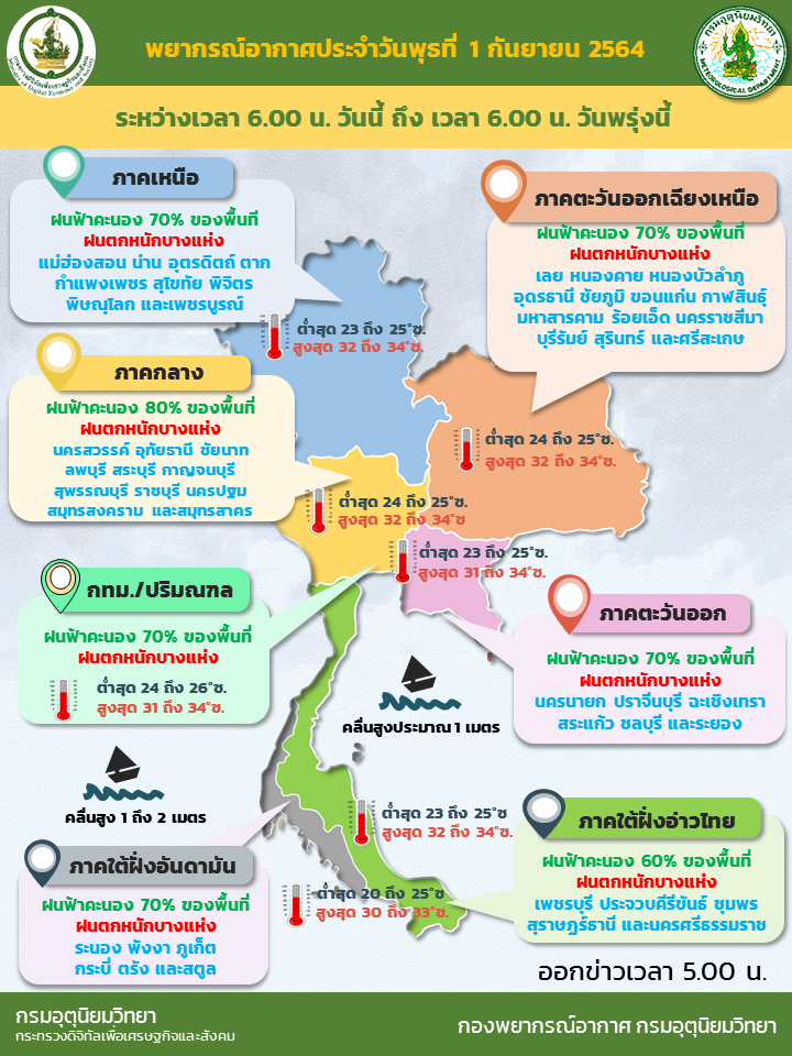 กรมอุตุนิยมวิทยาพยากรณ์อากาศ 24 ชั่วโมงข้างหน้า ร่องมรสุมพาดผ่านภาคเหนือตอนล่าง ภาคกลาง และภาคตะวันออกเฉียงเหนือ ประกอบกับมรสุมตะวันตกเฉียงใต้ที่พัดปกคลุมทะเลอันดามัน ประเทศไทย และอ่าวไทยเริ่มมีกำลังแรงขึ้น ลักษณะเช่นนี้ทำให้ประเทศไทยยังคงมีฝนตกต่อเนื่องกับมีฝนตกหนักบางแห่งในภาคเหนือ ภาคตะวันออกเฉียงเหนือ ภาคกลาง ภาคตะวันออก และภาคใต้ ขอให้ประชาชนที่อาศัยอยู่ในพื้นที่เสี่ยงภัยบริเวณดังกล่าวระวังอันตรายจากฝนตกหนักและฝนที่ตกสะสม ซึ่งอาจทำให้เกิดน้ำท่วมฉับพลันและน้ำป่าไหลหลากในระยะนี้ไว้ด้วย