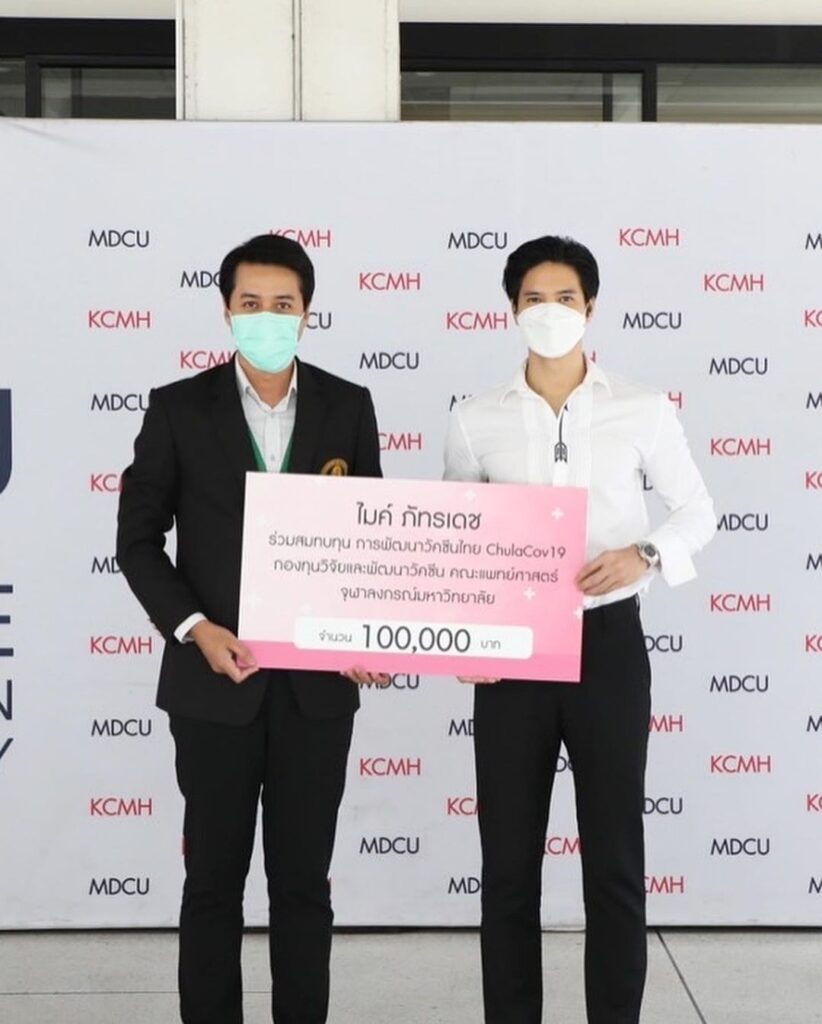 โดยหนุ่มไมค์ ได้โพสต์ภาพ พร้อมเขียนแคปชั่นเอาไว้ว่า “ขอเป็นส่วนหนึ่งในการร่วมสมทบทุน เพื่อพัฒนางานวิจัยวัคซีน ChulaCov19 เพื่อคนไทยและขอเป็นกำลังใจให้คุณหมอ ทีมวิจัยและบุคลากรทางการแพทย์ทุกท่านครับ”