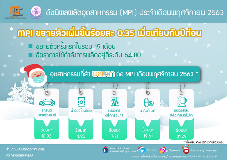 นายสุริยะ จึงรุ่งเรืองกิจ รัฐมนตรีว่าการกระทรวงอุตสาหกรรม (อก.) เปิดเผยว่า สำนักงานเศรษฐกิจอุตสาหกรรม (สศอ.) จัดทำดัชนีผลผลิตอุตสาหกรรม (MPI) โดยดัชนีผลผลิตอุตสาหกรรม (MPI) เดือนพฤศจิกายน 2563 ขยายตัวเพิ่มขึ้นร้อยละ 0.35 เมื่อเทียบจากช่วงเดียวกันของปีก่อน เป็นการขยายตัวครั้งแรกในรอบ 19 เดือนนับจากเหตุการณ์สงครามการค้าและการระบาดของไวรัสโควิด-19 สะท้อนให้เห็นว่าสถานการณ์การผลิตภาคอุตสาหกรรมได้ปรับตัวเพิ่มขึ้นอย่างต่อเนื่องจากการควบคุมการระบาดได้ดีและมีมาตรการกระตุ้นเศรษฐกิจในประเทศ โดยเฉพาะการขยายตัวเพิ่มขึ้นในอุตสาหกรรมสำคัญอย่างอุตสาหกรรมรถยนต์ที่ขยายตัวเพิ่มขึ้นร้อยละ 10.02 เมื่อเทียบจากช่วงเดียวกันของปีก่อน โดยการจำหน่ายในประเทศเพิ่มขึ้นครั้งแรกนับตั้งแต่มีการระบาด ในขณะที่การส่งออกหดตัวเล็กน้อยร้อยละ 0.87 นับเป็นการขยายตัวครั้งแรกในรอบ 19 เดือนเช่นกัน