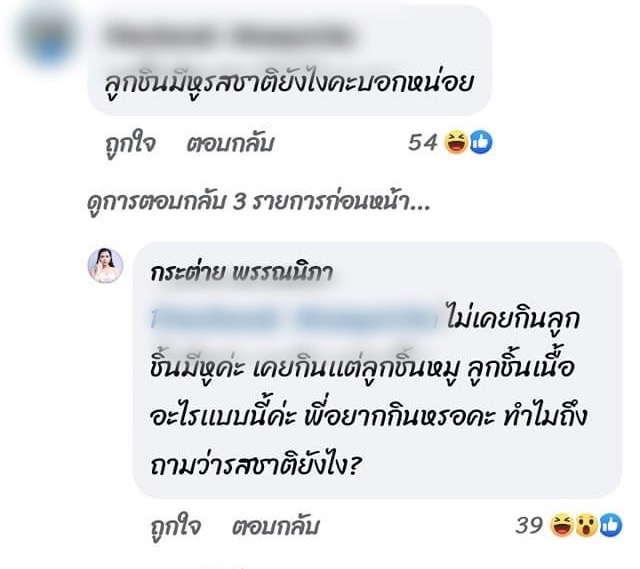 จากนั้นสาวกระต่ายก็ขอฟาดกลับแบบนิ่มๆไปว่า “ไม่เคยกินลูกชิ้นมีหูค่ะ เคยกินแต่ลูกชิ้นหมู ลูกชิ้นเนื้อ อะไรแบบนี้ค่ะ พี่อยากกินหรอคะ ทำไมถึงถามว่ารสชาติยังไง?”