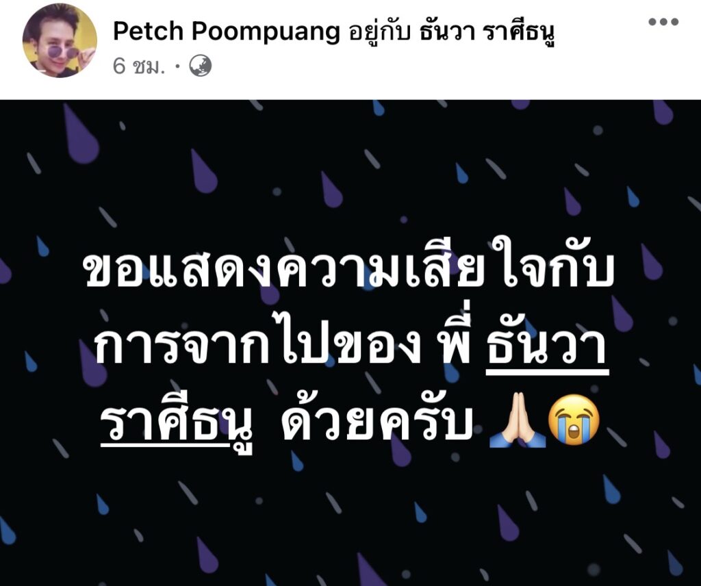 ด้าน เพชร พุ่มพวง หรือ เพชร ภควรรธน์ ลูกชายราชินีลูกทุ่ง พุ่มพวง ดวงจันทร์ ก็ได้โพสต์ข้อความแสดงความอาลัยด้วยเช่นกันว่า “ขอแสดงความเสียใจกับการจากไปของพี่ ธันวา ราศีธนู ด้วยครับ”