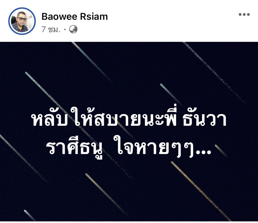 ขณะที่เพื่อนๆ ศิลปินต่างโพสต์ข้อความเพื่อเป็นการแสดงความอาลัยต่อการจากไปของ ธันวา ราศีธนู ซึ่งทางด้าน บ่าววี ได้โพสต์ข้อความไว้ว่า “หลับให้สบายนะพี่ ธันวา ราศีธนู ใจหายๆๆ…” และเมื่อมีคนเข้าไปคอมเมนต์สอบถามว่า “ธันวา เป็นอะไรเสีย” บ่าววีก็ได้ตอบกลับมาว่า “เป็นโควิด19”