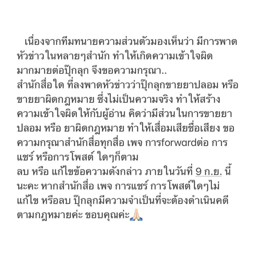 “เนื่องจากทีมทนายความส่วนตัวมองเห็นว่า มีการพาดหัวข่าวในหลายๆ สำนัก ทำให้เกิดความเข้าใจผิดมากมายต่อปุ๊กลุก จึงขอความกรุณา..สำนักสื่อใด ที่ลงพาดหัวว่าปุ๊กลุกขายยาปลอม หรือ ยาผิดกฎหมาย ทำให้เสื่อมเสียชื่อเสียง ขอความกรุณาสำนักสื่อทุกสื่อ เพจ การ forward ต่อ การแชร์ หรือการโพสต์ ใดๆ ก็ตาม ลบ หรือ แก้ไขข้อความดังกล่าว ภายในวันที่ 9 ก.ย. นี้นะคะ หากสำนักสื่อ เพจ การแชร์ การโพสต์ใดๆ ไม่แก้ไขหรือลบ ปุ๊กลุกมีความจำเป็นที่จะต้องดำเนินคดีตามกฎหมายค่ะ ขอบคุณค่ะ”