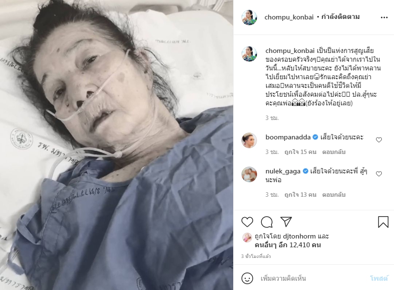 “เป็นปีแห่งการสูญเสียของครอบครัวจริงๆ คุณย่าได้จากเราไปในวันนี้ หลับให้สบายนะคะ ยังไม่ได้พาหลานไปเยี่ยมไปหาเลย รักและคิดถึงคุณย่าเสมอ หลานจะเป็นคนดีใช้ชีวิตให้มีประโยชน์เพื่อสังคมต่อไปค่ะ ปล.สู้ๆนะคะคุณพ่อ (ยังร้องให้อยู่เลย)”