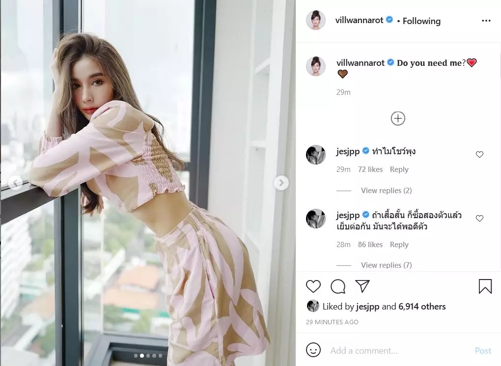 เป็นแฟนใคร ใครก็ต้องหวง สำหรับนางเอกสาว วิว-วรรณรท สนธิไชย หวานใจของพระเอกหนุ่ม เจษ เจษฎ์พิพัฒ ติละพรพัฒน์ ล่าสุดออกมาทำให้โซเชียลร้อนเป็นไฟอีกครั้ง หลังจากเจ้าตัว ได้โพสต์ภาพสุดหวิวใส่ชุดเอวลอยสีหวาน โชว์หน้าท้องแบนราบผ่านอินสตาแกรมส่วนตัว พร้อมแคปชั่น Do you need me? ด้านหวานใจอย่างหนุ่ม “เจษ” ก็เข้าไปคอมเมนต์ตอบแฟนสาวว่า “Sure” ขณะที่ “วิว” ก็ไปหยอดคำหวานกลับว่า” love you baby”