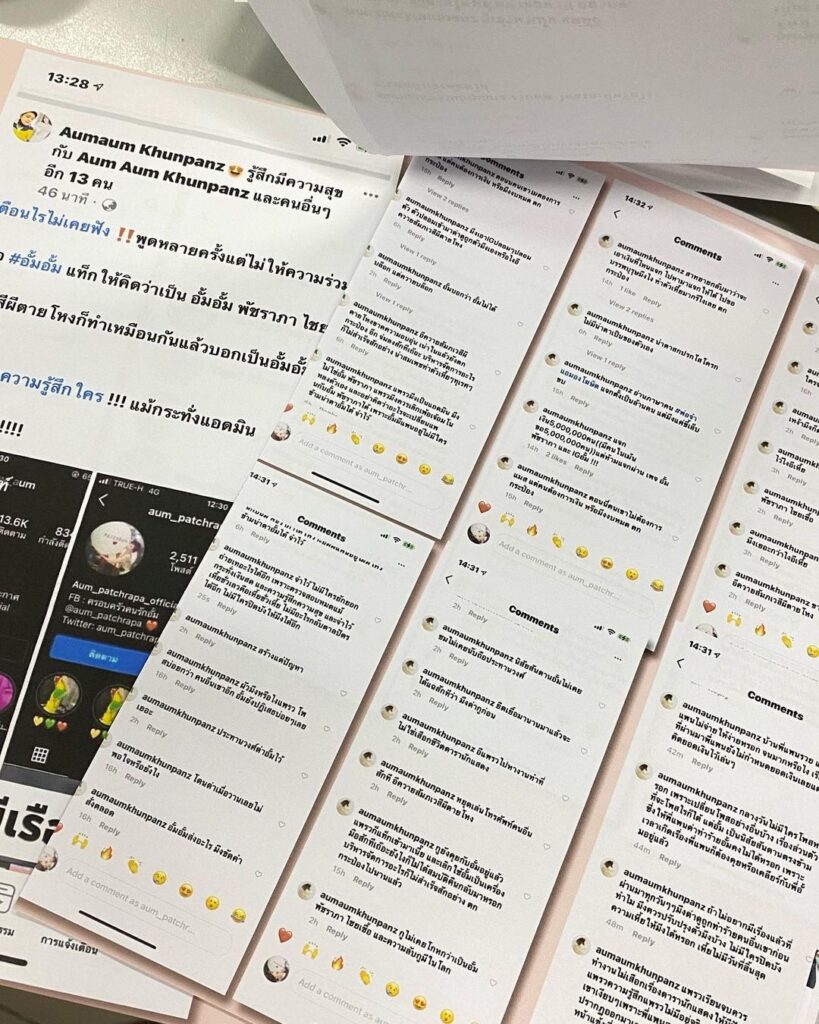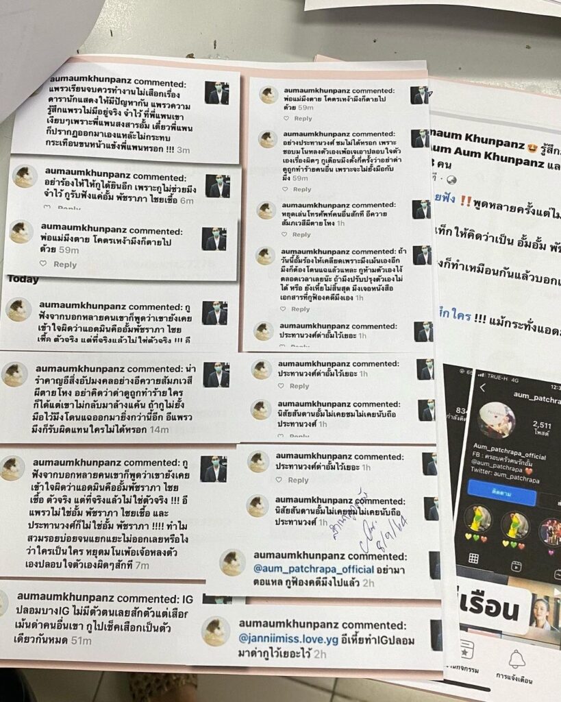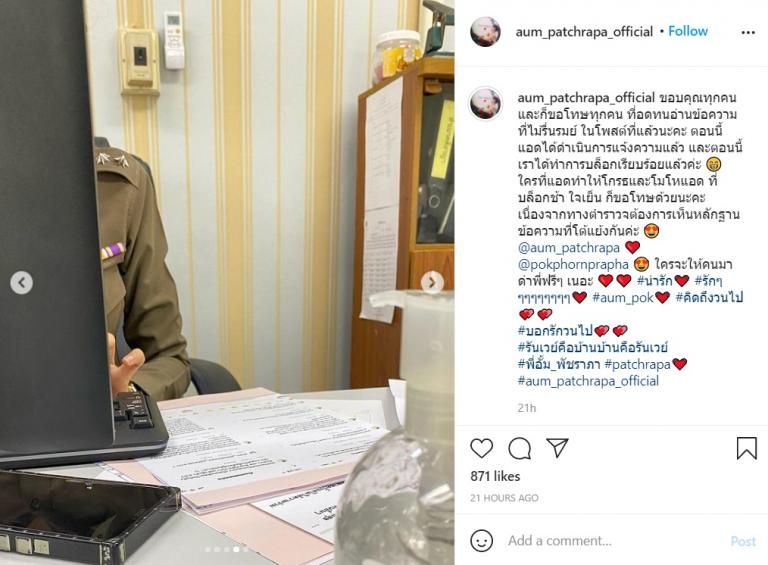 ล่าสุดทางแอดมินแฟนเพจอินสตาแกรม @aum_patchrapa_official ได้นำหลักฐานที่แคปมาโพสต์ เดินทางไปแจ้งความกับเจ้าหน้าที่เป็นที่เรียบร้อยแล้ว พร้อมกับระบุว่า