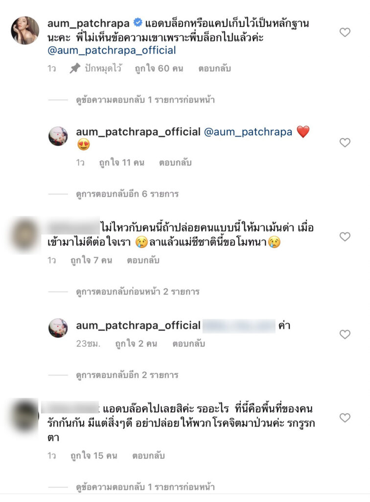 “ขอบคุณทุกคนและก็ขอโทษทุกคน ที่อดทนอ่านข้อความ ที่ไม่รื่นรมย์ ในโพสต์ที่แล้วนะคะ ตอนนี้แอดได้ดำเนินการแจ้งความแล้ว และตอนนี้เราได้ทำการบล็อกเรียบร้อยแล้วค่ะ 😁 ใครที่แอดทำให้โกรธและโมโหแอด ที่บล็อกช้า ใจเย็น ก็ขอโทษด้วยนะคะเนื่องจากทางตำราวจต้องการเห็นหลักฐานข้อความที่โต้แย้งกันค่ะ  @aum_patchrapa  @pokphornprapha ใครจะให้คนมาด่าพี่ฟรีๆ เนอะ”