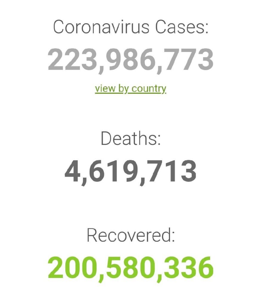 เว็บไซต์ worldometers รายงานสถานการณ์โควิด-19 ประจำวันที่ 10 กันยายน 2564 ช่วงเวลาประมาณ 07.30 น.ตามเวลาประเทศไทย พบผู้ติดเชื้อทั่วโลก 223,986,773 ราย เพิ่มขึ้น 592,623 ราย เสียชีวิต 4,619,713 รายเพิ่มขึ้น 9,230 ราย รักษาหาย 200,580,336 ราย