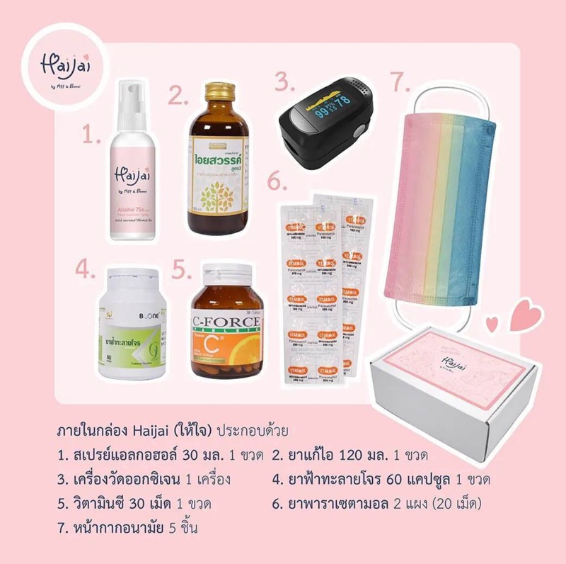 ทั้งนี้ในแต่ละกล่อง จะประกอบไปด้วยของ 7 อย่าง ได้แก่ แอลกอฮอล์ 30 มล. 1 ขวด, ยาแก้ไอ 120 มล. 1 ขวด , เครื่องวัดออกซิเจน 1 เครื่อง, ยาฟ้าทะลายโจร 60 แคปซูล, วิตามินซี 30 เม็ด, ยาพาราเซตามอล 20 เม็ด และหน้ากากอนามัย 5 ชิ้น และที่พิเศษสุดลวดลายที่เห็นบนกล่อง เป็นฝีมือการวาดของน้องปี ที่ออกแบบด้วยตัวเอง แทนความรักและห่วงใยจากใจสองแม่ลูก