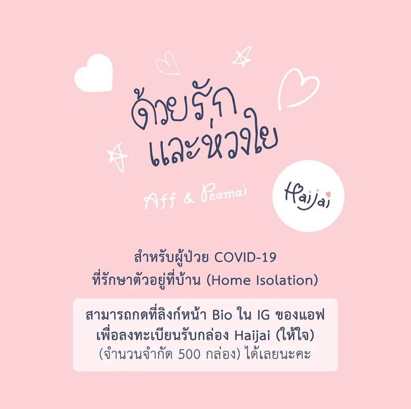 “ให้ใจ (HaiJai) แทนความรัก ความห่วงใย จากใจเรา 2 คน เพื่อร่วมช่วยเหลือด้านต่างๆ ในสังคมอย่างต่อเนื่อง โดยเฉพาะตอนนี้ คือ ผู้ที่ได้รับผลกระทบจาก Covid-19 ค่ะ
