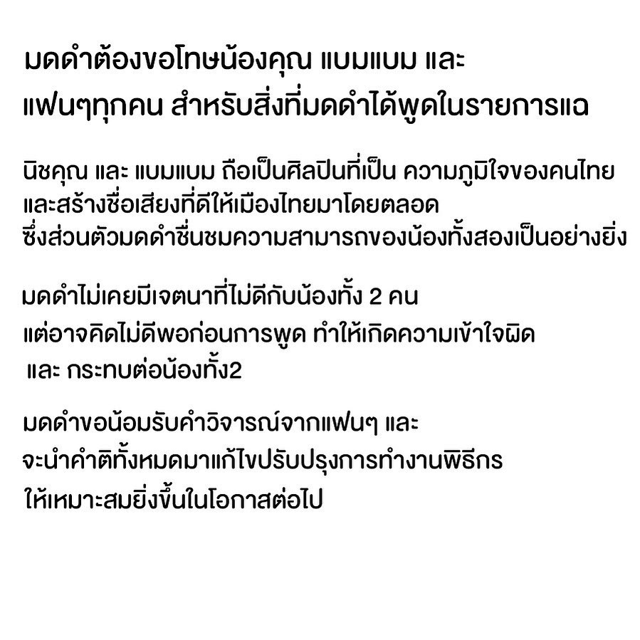 “มดดำต้องขอโทษน้องคุณ แบมแบม และ แฟนๆทุกคน สำหรับสิ่งที่มดดำได้พูดในรายการแฉ นิชคุณ และ แบมแบม ถือเป็นศิลปินที่เป็น ความภูมิใจของคนไทย และสร้างชื่อเสียงที่ดีให้เมืองไทยมาโดยตลอด