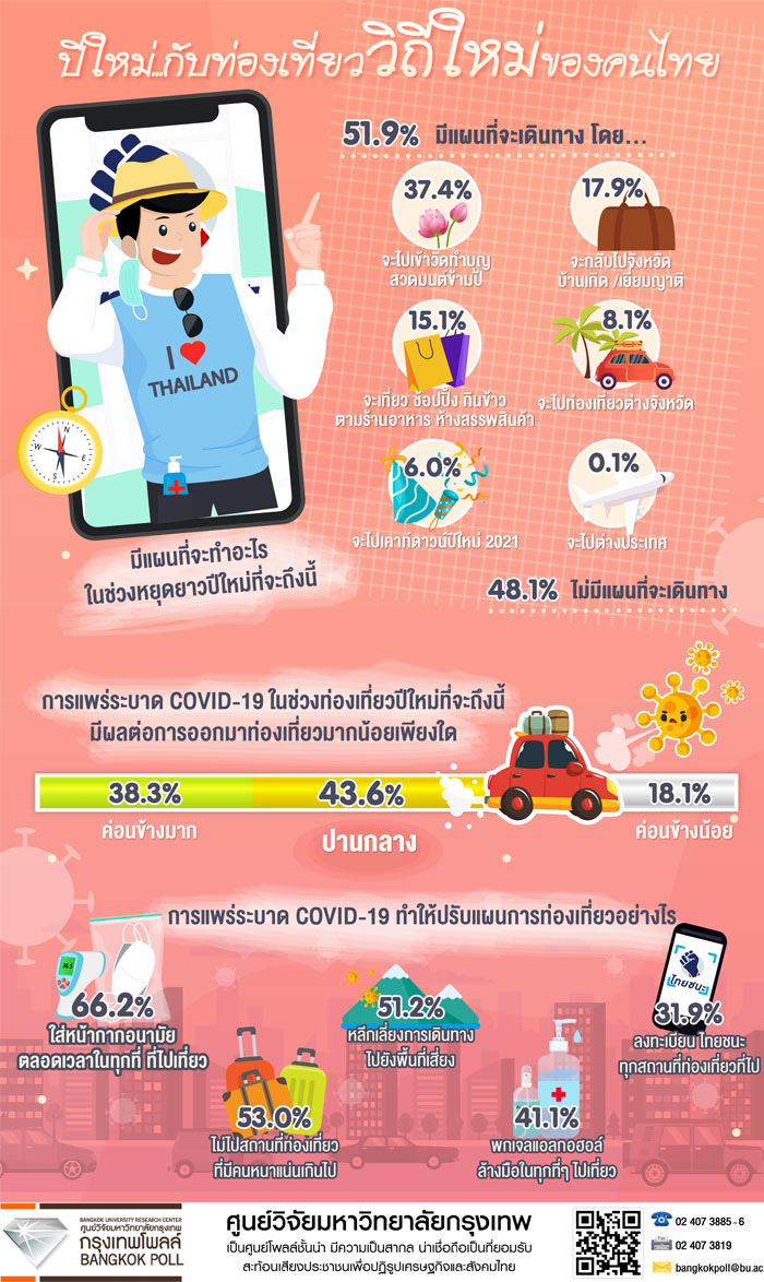 “กรุงเทพโพลล์” ศูนย์วิจัยมหาวิทยาลัยกรุงเทพ เปิดเผยผลสำรวจความคิดเห็นประชาชน เรื่อง “ปีใหม่…กับท่องเที่ยววิถีใหม่ของคนไทย” โดยเก็บข้อมูลกับประชาชนจากทุกภูมิภาคทั่วประเทศจำนวน 1,184 คน ระหว่างวันที่ 14-16 ธ.ค. ที่ผ่านมา พบว่า ร้อยละ 51.9 มีแผนที่จะเดินทางในช่วงหยุดยาวปีใหม่ ,โดยร้อยละ 37.4 จะไปเข้าวัดทำบุญ สวดมนต์ข้ามปี, ร้อยละ 17.9 จะกลับไปจังหวัดบ้านเกิด เยี่ยมญาติ และร้อยละ 15.1 จะเที่ยว ช้อปปิ้ง กินข้าว ตามร้านอาหาร ห้างสรรพสินค้า แต่ ร้อยละ 48.1 ไม่มีแผนที่จะเดินทาง อย่างไรก็ตามเมื่อถามเมื่อถามว่าการแพร่ระบาด COVID-19 ทำให้ปรับแผนการท่องเที่ยวอย่างไร พบว่า ร้อยละ 66.2 จะใส่หน้ากากอนามัยตลอดเวลาในทุกที่ๆ ไปเที่ยว,ร้อยละ 53.0 จะไม่ไปสถานที่ท่องเที่ยวที่มีคนหนาแน่นเกินไป, ร้อยละ 51.2 จะหลีกเลี่ยงการเดินทางไปยังพื้นที่เสี่ยง, ร้อยละ 41.1 จะพกเจลแอลกอฮอล์ล้างมือในทุกที่ๆ ไปเที่ยว และร้อยละ 31.9 จะลงทะเบียน ไทยชนะ ทุกสถานที่ท่องเที่ยวที่ไป ทั้งนี้ ร้อยละ 43.6 มองว่า โควิด-19 มีผลต่อการออกมาท่องเที่ยวระดับปานกลาง,ร้อยละ 38.3 เห็นว่ามีผลค่อนข้างมากถึงมากที่สุด ส่วนร้อยละ18.1 เห็นว่ามีผลค่อนข้างน้อยถึงน้อยที่สุด