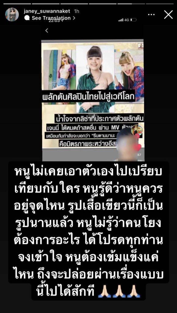 ล่าสุด สาวเจนนี่ ได้โพสต์ข้อความระบายความใจใจผ่านอินสตาแกรมสตอรี่ว่า “หนูไม่เคยเอาตัวเองไปเปรียบเทียบกับใคร หนูรู้ดีว่าหนูควรอยู่จุดไหน รูปเสื้อเขียวนี้ก็เป็นรูปนานแล้ว หนูไม่รู้ว่าคนโยงต้องการอะไร ได้โปรดทุกท่านจงเข้าใจ หนูต้องเข้มแข็งแค่ไหน ถึงจะปล่อยผ่านเรื่องแบบนี้ไปได้สักที”