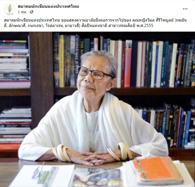 โดยเฟซบุ๊ก “สมาคมนักเขียนแห่งประเทศไทย” ได้โพสต์ขอแสดงความอาลัยว่า “ขอแสดงความอาลัยยิ่งต่อการจากไปของ คุณหญิงวิมล ศิริไพบูลย์ (ทมยันตี, ลักษณวดี, กนกเรขา, โรสลาเรน, มายาวดี) ศิลปินแห่งชาติ สาขาวรรณศิลป์ พ.ศ.2555”