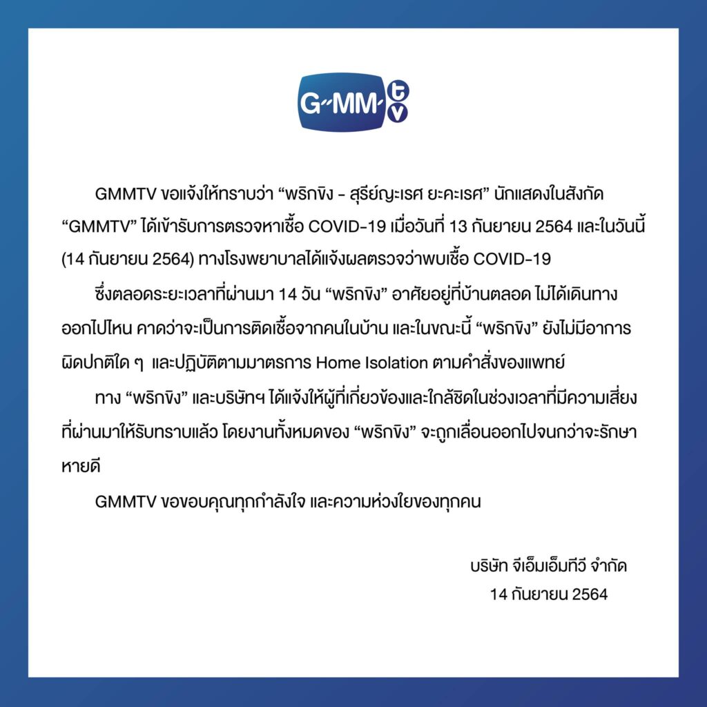 โดยทาง GMMTV ได้โพสต์รายละเอียด ลงในอินสตาแกรม พร้อมทั้งชี้แจงว่า “พริกขิง สุรีย์ญะเรศ ยะคะเรศ” นักแสดงในสังกัด GMMTV ได้เข้ารับการตรวจหาเชื้อ COVID-19 เมื่อวันที่ 13 กันยายน 2564 และในวันนี้ (14 กันยายน 2564) ทางโรงพยาบาลได้แจ้งผลตรวจว่าพบเชื้อ COVID-19