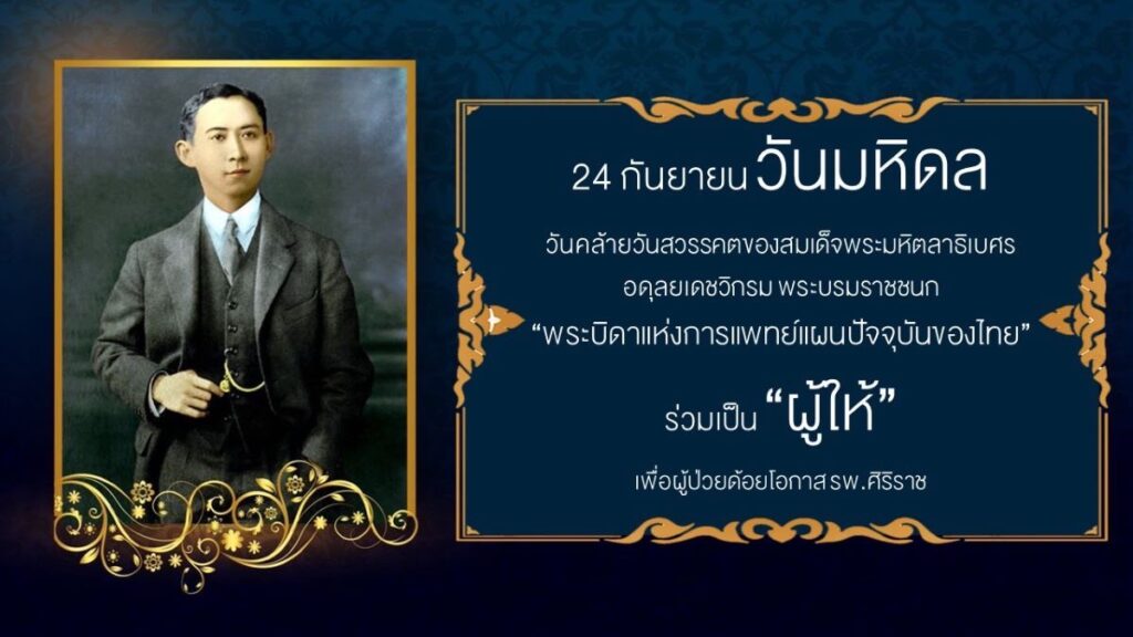 “วันมหิดล” ของทุกปี ทางคณะแพทยศาสตร์ศิริราชพยาบาล ถือเป็นประเพณีปฏิบัติ น้อมพระเกียรติ และสำนึกในพระมหากรุณาธิคุณ พร้อมเปิดโอกาสให้ประชาชนร่วมเป็นผู้ “ให้” ด้วยการบริจาคตามรอยพระบาทช่วยเหลือผู้ป่วยด้อยโอกาส รพ.ศิริราช ซึ่งใน “วันมหิดล” 24 กันยายน ปี 2564 เนื่องจากสถานการณ์การแพร่ระบาดของโควิด-19 ส่งผลให้การจัดกิจกรรมเฉลิมพระเกียรติต่างๆ จะปรับเปลี่ยนรูปแบบให้เหมาะสมกับสถานการณ์ขณะนี้