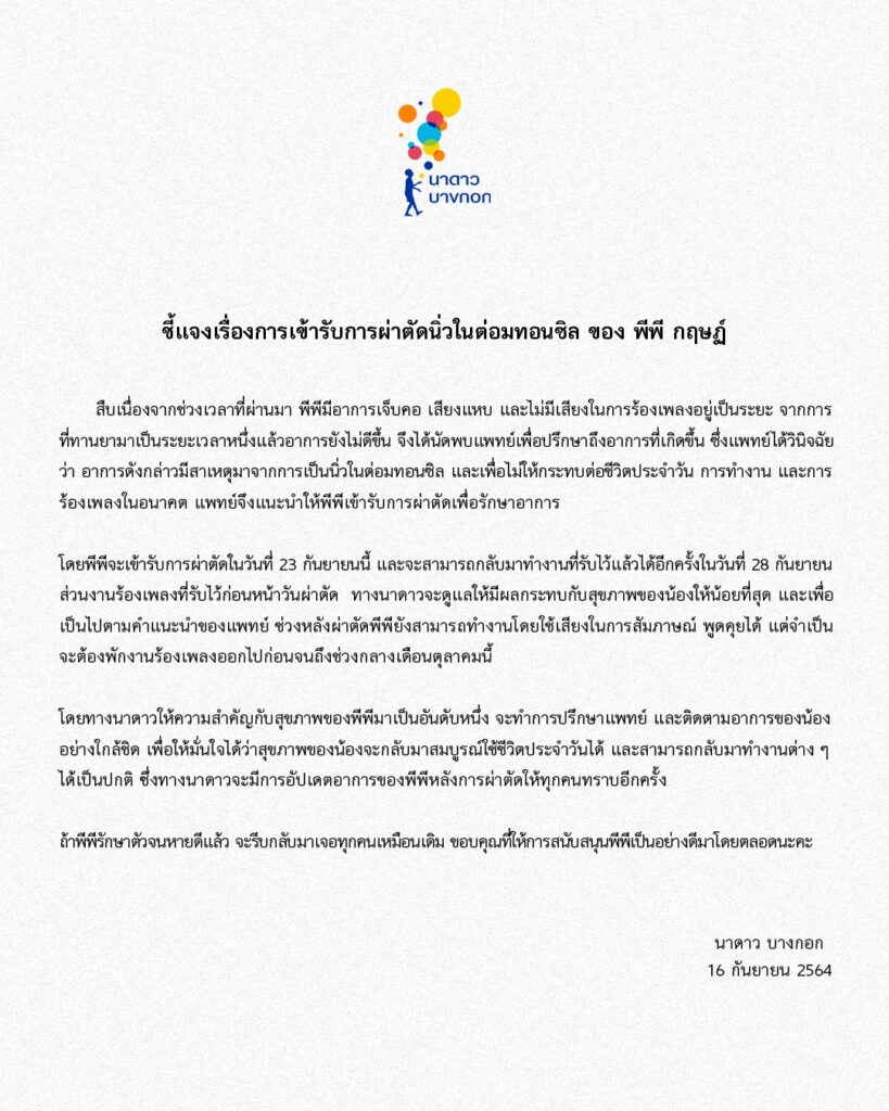โดยพีพีจะเข้ารับการผ่าตัดในวันที่ 23 กันยายนนี้ และจะสามารถกลับมาทำงานที่รับไว้แล้วได้อีกครั้งในวันที่ 28 กันยายน ส่วนงานร้องเพลงที่รับไว้ก่อนหน้าวันผ่าตัด ทางนาดาวจะดูแลให้มีผลกระทบกับสุขภาพของน้องให้น้อยที่สุด และเพื่อเป็นไปตามคำแนะนำของแพทย์ ช่วงหลังผ่าตัด พีพียังสามารถทำงานโดยใช้เสียงในการสัมภาษณ์ พูดคุยได้ แต่จำเป็นจะต้องพักงานร้องเพลงออกไปก่อนจนถึงช่วงกลางเดือนตุลาคมนี้