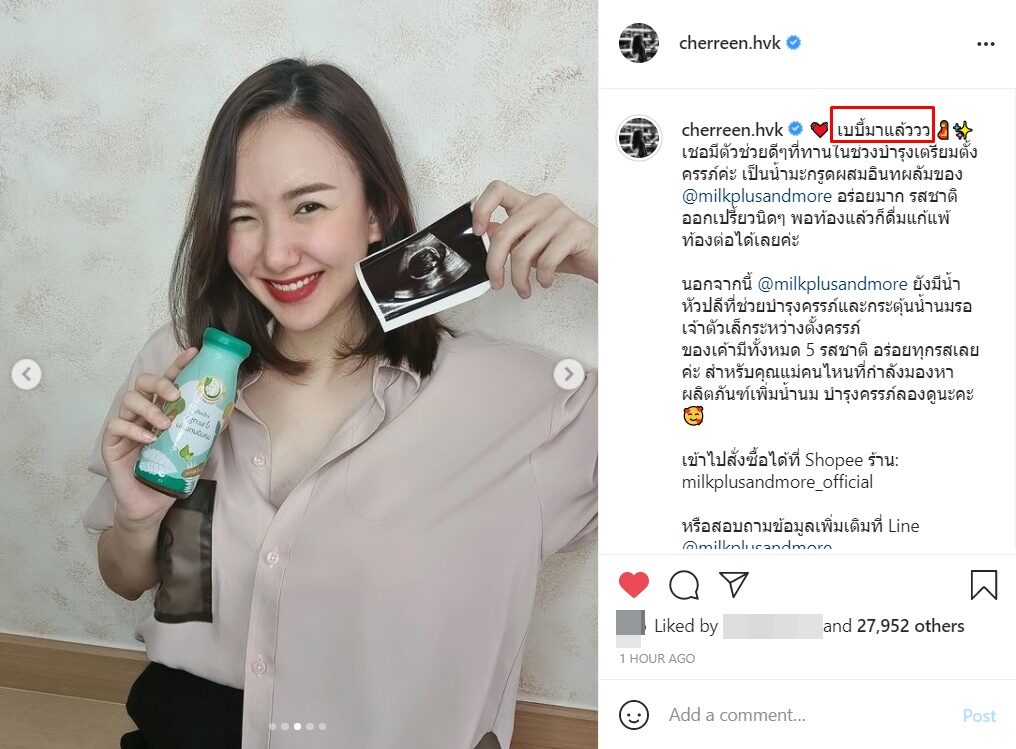ล่าสุดสาวเชอรีนได้โพสต์อินสตาแกรมส่วนตัวอวดภาพ อัลตราซาวด์ ลูกในท้องอย่างตื่นเต้น พร้อมระบุแคปชั่นว่า “มาครบทุกนิ้ว แต่หน้าไม่มา แถมหันหลังหนีอีก โอเคให้ลุ้นเจอทีเดียวเนอะ”