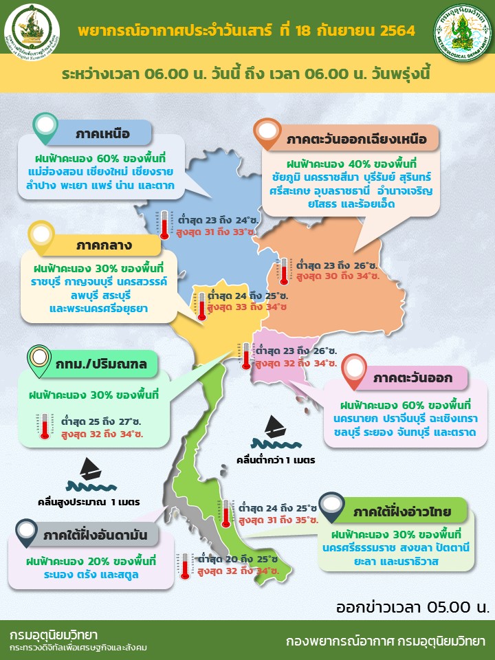 สำหรับคลื่นลมบริเวณทะเลอันดามันและอ่าวไทยมีกำลังอ่อนลง โดยทะเลอันดามันมีคลื่นสูงประมาณ 1 เมตร และอ่าวไทยมีคลื่นต่ำกว่า 1 เมตร ส่วนบริเวณที่มีฝนฟ้าคะนองคลื่นสูง 1-2 เมตร ขอให้ชาวเรือเดินเรือด้วยความระมัดระวัง และหลีกเลี่ยงการเดินเรือบริเวณที่มีฝนฟ้าคะนองไว้ด้วย
