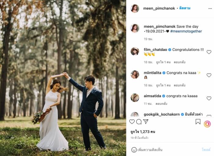 โดยสาวมีน ได้โพสต์ภาพแห่งความสุข ลงในอินสตาแกรมส่วนตัวพร้อมระบุข้อความไว้ว่า “Save the day 19.09.2021 #meenmotogether”