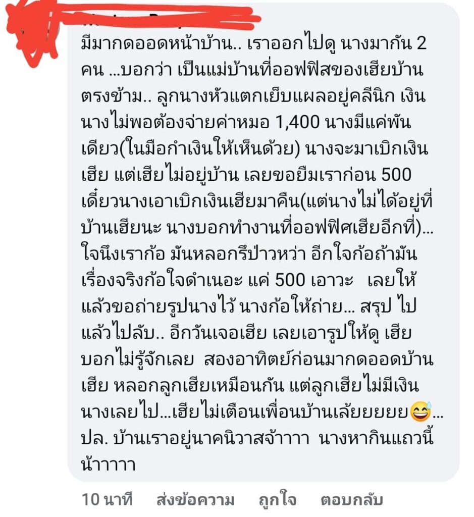 “ใจหนึ่งเราก็ มันหลอกหรือเปล่าหว่า อีกใจก็ถ้ามันเรื่องจริงก็ใจดำเนอะ แค่ 500 บาท เอาวะ เลยให้ แล้วขอถ่ายรูปนางไว้ นางก็ให้ถ่าย … สรุปไปแล้วไปลับ.. อีกวันเจอเฮีย เลยเอารูปให้ดู เฮียบอกไม่รู้จักเลย สองอาทิตย์ก่อนมากดออดบ้านเฮีย หลอกลูกเฮียเหมือนกัน แต่ลูกเฮียไม่มีเงิน นางเลยไป … เฮียไม่เตือนเพื่อนบ้านเล้ยยยยย ปล. บ้านเราอยู่นาคนิวาสจ้าาาา นางหากินแถวนี้น้าาาาา”
