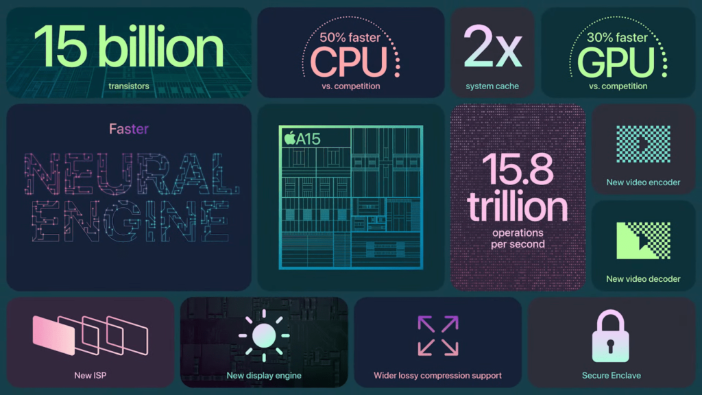 iPhone 13 Pro Max ใช้ชิปเซ็ตประมวลผลรุ่นใหม่ Apple A15 Bionic ที่อัปเกรดความสามารถขึ้นมารอบด้าน ไม่ว่าจะเป็นด้านการประมวลผลทั่วไป, GPU, AI และการประหยัดพลังงาน โดยที่ iPhone 12 Pro Max ใช้ชิปเซ็ตประมวลผล Apple A14 Bionic ซึ่งอาจจะไม่ต่างกันมาก แต่ที่ต่างกันแน่ๆ คือ iPhone 13 ในรุ่น Pro หรือ Pro Max มีหน้าจอ ProMotion ที่รองรับอัตรารีเฟรช 120Hz โดยรวมน่าจะช่วยให้ประสบการณ์การใช้งานดีขึ้นพอสมควร ซึ่งรุ่นเดิมอยู่ที่ 60Hz เท่านั้น และใน iPhone 13 Pro Max ยังมีการเพิ่มความจุของเครื่องสูงสุด 1TB อีกด้วย