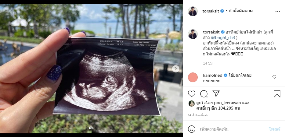 แต่พอเลื่อนไปเจอแคปชั่นที่เขียนไว้ก็เงิบกันเป็นแถบ โดยหนุ่มโต๋ ระบุว่า “อาทิตย์ก่อนได้เป็นน้า (ลูกพี่สาว @bright_ch3 ) อาทิตย์นี้จะได้เป็นลุง (ลูกน้องชายผมเอง)ส่วนอาทิตย์หน้า … จังหวะบังเอิญแหละเนอะ ไม่กดดันอะไร” ขณะที่สาว ไบรท์ พิชญทัฬห์ หวานใจก็เข้ามาคอมเมนต์ ส่งรูปหัวใจให้ นอกจากนี้ยังมีคนบันเทิงเข้ามาคอมเมนต์แซวหนุ่มโต๋กันอย่างล้นหลาม