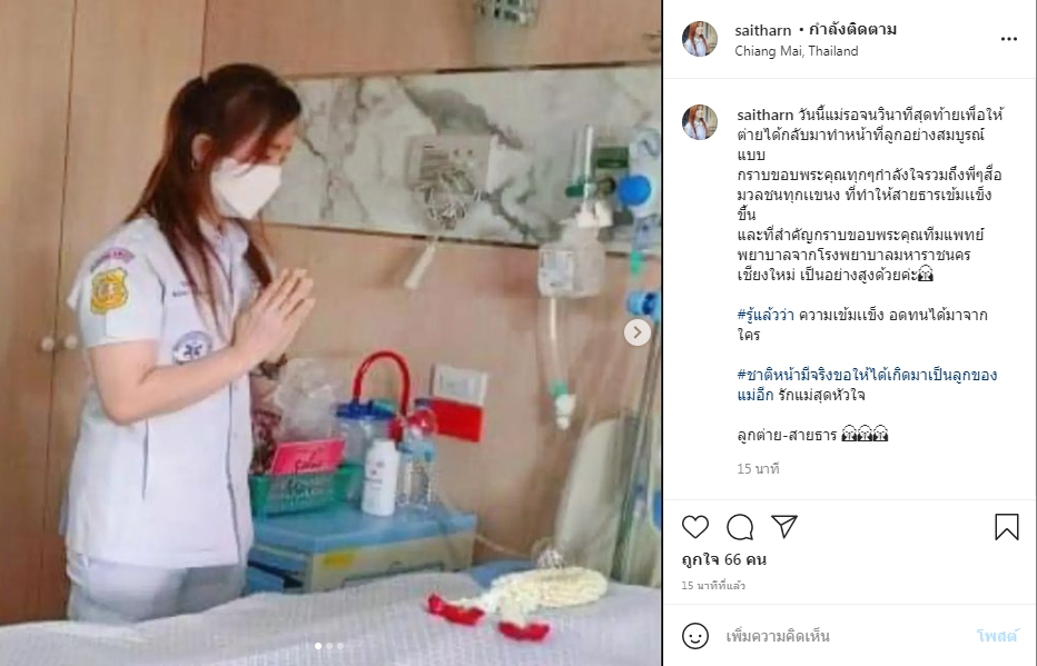 ทั้งนี้ ต่าย สายธาร ได้โพสต์ภาพตนเองกราบลา และ สวมกอดแม่เป็นวาระสุดท้าย ผ่านอินสตาแกรมส่วนตัว พร้อมเขียนแคปชั่นว่า