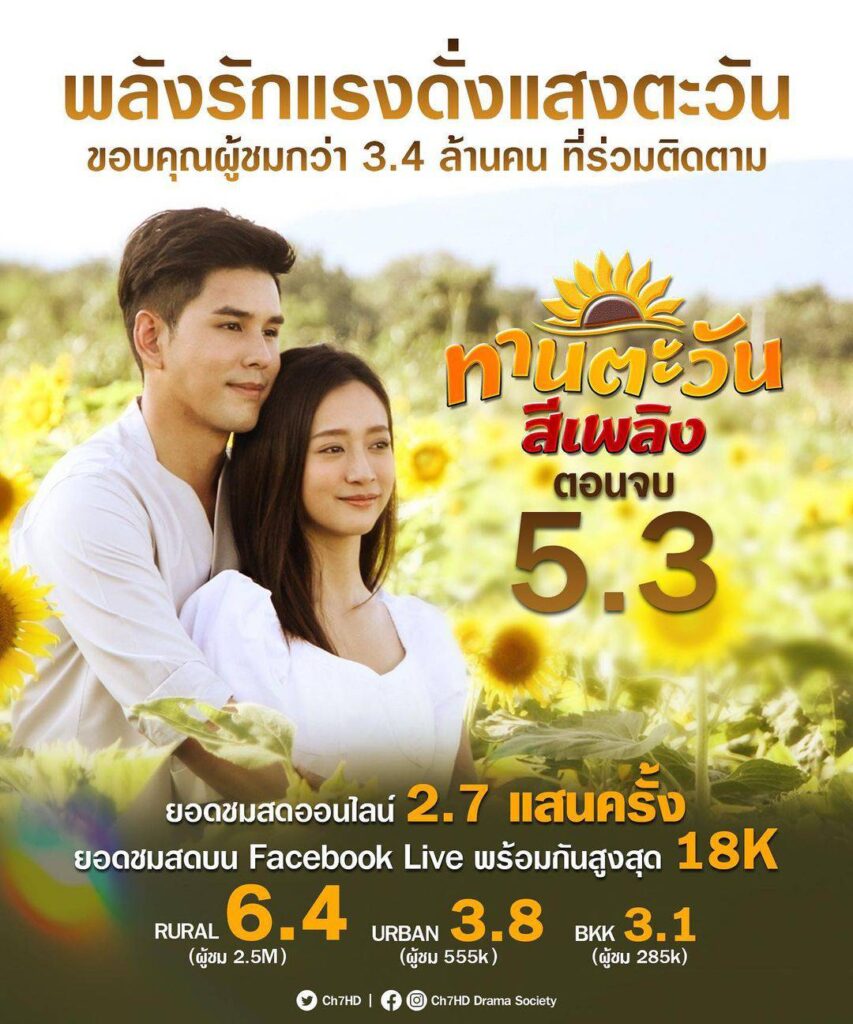 หันมาที่ละครก่อนข่าวภาคค่ำ ทานตะวันสีเพลิง เรื่องราวโรแมนติกดราม่าสุดเข้มข้นจากค่ายปภัสรา โปรดักชั่น ได้นางเอกขวัญใจผู้ชม ชิงชิง-คริษฐา สังสะโอภาส จับคู่กับ อั๋น-อัครพรรฒ บุนนาค สามารถทำเรตติ้งตอนจบสูงถึง 5.3