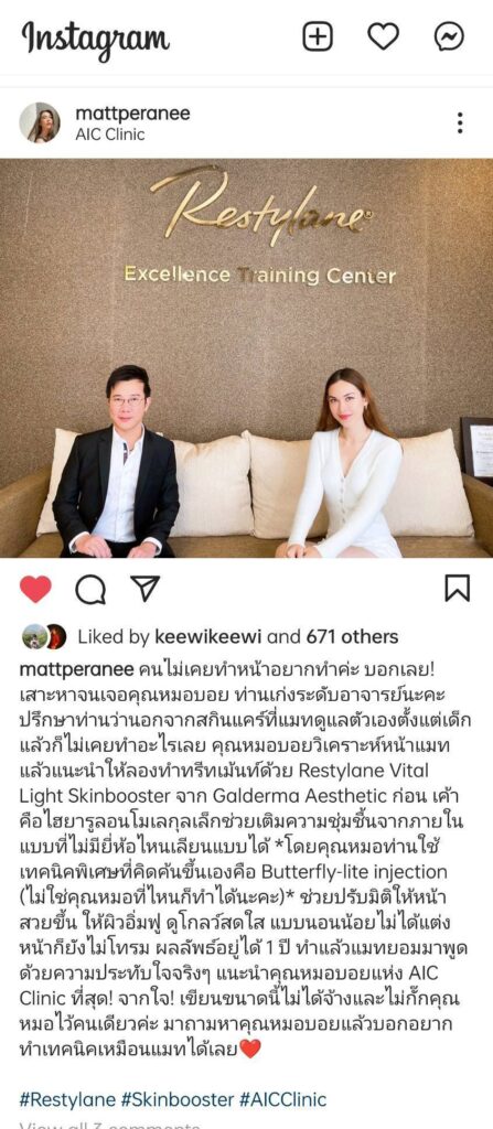 “คนไม่เคยทำหน้า อยากทำค่ะ บอกเลย….นอกจากสกินแคร์ที่แมทดูแลตัวเองตั้งแต่เด็กแล้ว ก็ไม่เคยทำอะไรเลย คุณหมอวิเคราะห์หน้าแมทแล้วแนะนำให้ลองทำทรีทเม้นท์ Restylaen Vital Light Skinbooster จาก Galderma Aesthetic ก่อน เค้าคือ ไฮยารูลอน โมเลกุลเล็กช่วยเติมความชุ่มชื้นจากภายใน แบบที่ไม่มียี่ห้อไหนเลียนแบบได้ โดยคุณหมอท่านใช้เทคนิคพิเศษที่คิดค้นขึ้นเองคือ Butterfly-lite injection (ไม่ใช่คุณหมอที่ไหนก็ทำได้นะคะ) *ช่วยปรับมิติให้หน้าสวยขึ้น ให้ผิวอิ่มฟู ดูโกล์ดสดใส แบบนอนน้อยยังไม่ได้แต่งหน้าก็ยังไม่โทรม ผลลัพธ์อยู่ได้ 1 ปี ทำแล้วแมทยอมมาพูดด้วยความประทับใจ AIC Clinic ที่สุด! จากใจ! เขียนขนาดนี้ไม่ได้จ้างและไม่กั๊กคุณหมอไว้คนเดียวค่ะ”