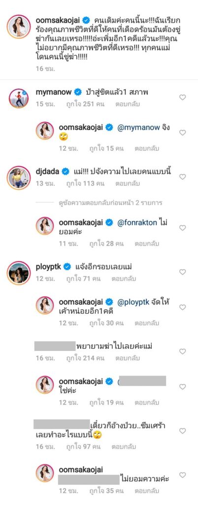 ซึ่งสาวอ๋อม ได้เผยผ่านทางแคปชั่นว่า “คนเดิมค่ะคนนี้นะ!!! ฉันเรียกร้องคุณภาพชีวิตที่ดีให้คนที่เดือดร้อนมันต้องขู่ฆ่ากันเลยเหรอ!!!! อ่ะเพิ่มอีก1คดีแล้วนะ!!!คุณไม่อยากมีคุณภาพชีวิตที่ดีเหรอ!!! ทุกคนแม่โดนคนนี้ขู่ฆ่า!!!!!”