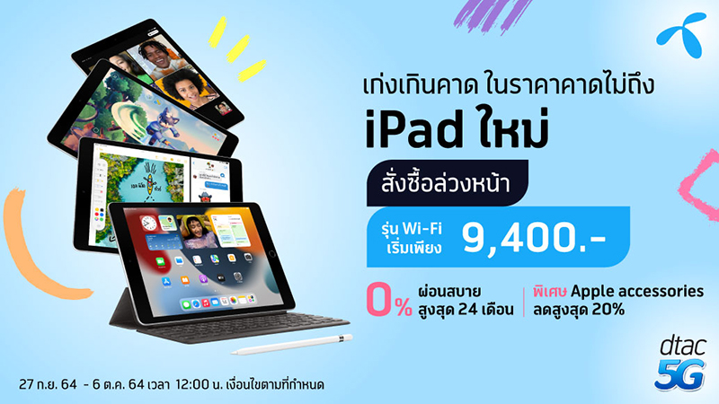 ดีแทคเตรียมวางจำหน่าย iPad (รุ่นที่ 9) รุ่น Wi-Fi และ iPad mini รุ่น Wi-Fi ที่มากความสามารถและราคาประหยัด ในดีไซน์ใหม่แบบหน้าจอทั้งหมด เริ่มจาก iPad mini มาพร้อมดีไซน์แบบหน้าจอทั้งหมดชิป A15 Bionic, 5G, คุณสมบัติ “จัดให้อยู่ตรงกลาง” และอีกมากมาย ในขณะที่ iPad มีชิป A13 Bionic ที่ออกแบบโดย Apple, คุณสมบัติ “จัดให้อยู่ตรงกลาง”การแสดงผลแบบ True Tone และวันนี้มีพื้นที่จัดเก็บข้อมูลเริ่มต้นเพิ่มขึ้นสองเท่า ลูกค้าจะสามารถสั่งซื้อ iPad (รุ่นที่ 9) รุ่น Wi-Fi และ iPad mini รุ่น Wi-Fi ได้ตั้งแต่วันที่ 27 กันยายน 2564 ดูรายละเอียดเกี่ยวกับราคาและการวางจำหน่ายได้ที่ www.dtac.co.th