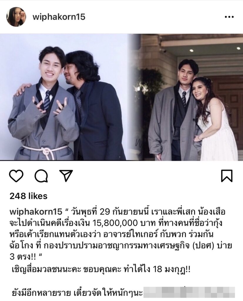ล่าสุด “กานต์ วิภากร” ได้ออกมาโพสต์แจ้งข่าวผ่านอินสตาแกรมส่วนตัว พร้อมระบุข้อความว่า “วันพุธที่ 29 กันยายนนี้ เราและพี่เสก น้องเสือ จะไปดำเนินคดีเรื่องเงิน 15,800,000 บาท ที่ทางคนที่ชื่อว่ากุ้งหรือเขาเรียกแทนตัวเองว่า อาจารย์ไทเกอร์ กับพวก ร่วมกันฉ้อโกง ที่ กองปราบปรามอาชญากรรมทางเศรษฐกิจ (ปอศ) บ่าย 3 ตรง!!  เชิญสื่อมวลชนนะคะ ขอบคุณค่ะ ทำได้ไง 18 มงกุฎ!! ยังมีอีกหลายราย เดี๋ยวจัดให้หนักๆนะ พวกไร้ศักดิ์ศรี น่ารักเกียจ”