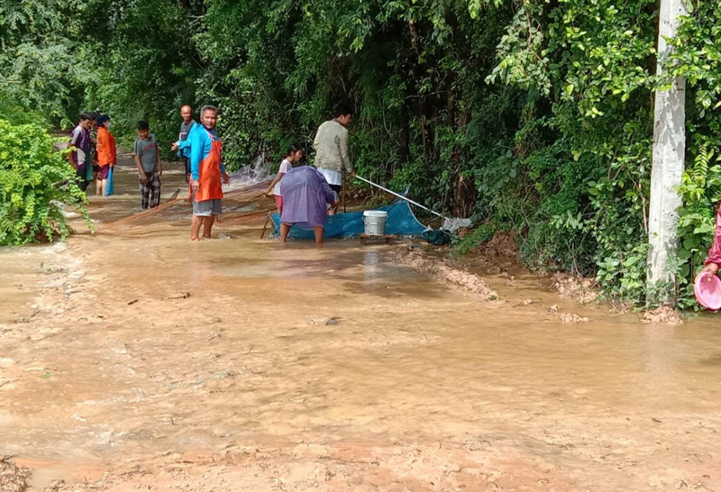 พบว่าบริเวณถนนยังมีน้ำท่วมขังสูง ระดับน้ำท่วมสูงประมาณ 30 เซนติเมตร รถยนต์สัญจรผ่านไปมาลำบาก แต่ก็ยังมีชาวบ้านนำแหไปหว่านจับปลาบนถนน เนื่องจากกระแสน้ำที่ไหลหลากมาท่วมถนน ทำให้มีปลาเล็กปลาน้อยไหลตามมากับกระแสน้ำ และชาวบ้านสามารถหาจับปลาที่ไหลตามมากับกระแสน้ำได้เป็นจำนวนมาก